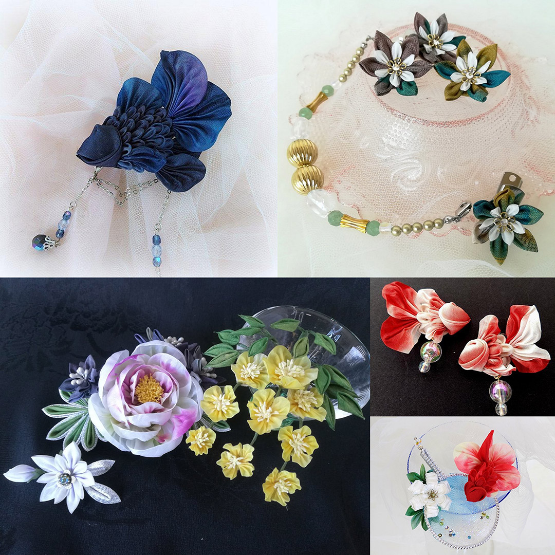 花と金魚のひと味違うつまみ細工。髪飾り、帯留め、羽織紐等の和装品に限らずブローチ、耳飾り、クリップ等洋服・普段使い用のアクセサリーも多数。金魚ファンの方も是非お越しを。