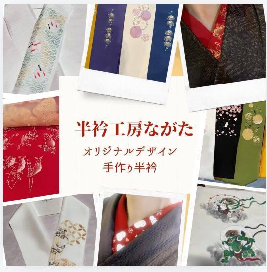 着物の長襦袢につける半衿にオリジナルデザインでひとつひとつ手作りをしています。刷り込み友禅の技法を使い筆と顔料を使用し作っています。半衿の柄は現在42種類あり半衿の色をかえると無限になります。